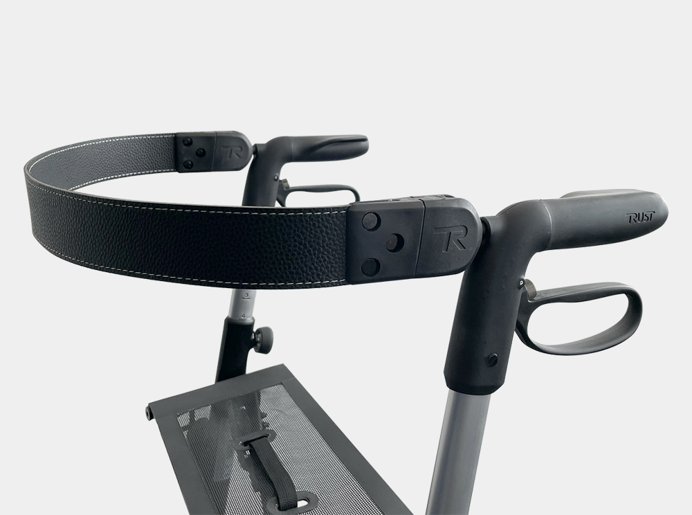 Det eleganta ryggstödsbandet är gjort i skinnimitation och finns i två färger. Det monteras lätt med två skruvar och kan fällas ihop med rollatorn. Ryggbandet passar till alla utomhus rollatorer från Trust Care.